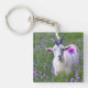 Ce porte - clé présente une chèvre douce et heureuse dans un champ de fleurs sauvages.
