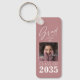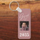 Un nouveau porte - clé à la mode, à deux côtés, en aluminium robuste, Graduate - porte-clés avec votre photo à l'avant. Tous Personnalisés, avec "Grad" en élégant script d'encre de calligraphie avec "Class of, The Year, School Name & Your Name" dans la typographie moderne. La photo du diplômé est habillée d'un délicat dégradé. Le texte et la garniture sont blancs avec l'arrière - plan dans une couleur rose rousse poussiéreuse. Si vous le souhaitez, modifiez facilement la couleur arrière - plan à la couleur primaire de votre école. L'idée cadeau parfait pour les étudiants du secondaire, du collège et de l'université.