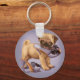 Un mignon chien chiot carlin tenant un stiletto bleu dans sa bouche avec un arrière - plan bleu clair, peint par l'artiste Maryline Cazenave.