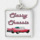 Grand porte - clé carré en métal haut de gamme avec l'image d'une Cadillac rose classique et les mots "Classy Chassis" (argot les années 50) dans les lettres de pois rose et noir style les années 50. Voir bouton carré correspondant et collier carré. Voir l'ensemble de la collection de Porte - clés Nifty les années 50 dans les TOUCHES SPÉCIALES | Section Favoris.
