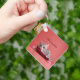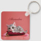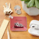 Un mignon chat tabby en caricature gris et blanc pond sur un coussin couleur grenat avec oeillets roses à proximité.
