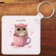 Un porte - clé avec une adorable image d'un hibou assis dans une tasse à café. Des coeurs se balançant et un seul rose placé au fond de la tasse.