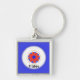 Un frisbee blanc aux motifs rouges et bleus sur un arrière - plan bleu. Le mot 'frisbee' peut être modifié ou supprimé. Le sport de disque volant ultime.