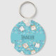 Un porte - clé avec un mignon motif de chat, posé sur un arrière - plan bleu et décoré d'arcs-en-ciel et d'empreintes de pattes et plus encore.