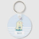 Un porte - clé personnalisé avec un mignon dinosaure souriant, des joues roses et RAWR écrit sur son ventre. 3 étoiles joyeuses et colorées au-dessus de sa tête. Placé sur un motif bleu clair et blanc de pois et rayures.