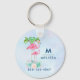 Porte - clé personnalisé avec un nom, une initiale et un numéro de téléphone. Conçu avec l'illustration d'une maman et d'un bébé flamant rose debout sur un lit de fleurs florales succulentes avec des palmiers verts se balançant dans le dos. Tropical et joli. L'arrière - plan est une aquarelle d'été bleu clair avec des touches de violet.