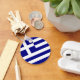 Drapeau de la Grèce. Le drapeau de la Grèce (communément appelé "bleu-blanc ciel" ou "bleu-blanc" et en grec : "Γ α ν λ λ " ou " "), officiellement reconnu par la Grèce comme l'un de ses symboles nationaux, est basé sur neuf bandes horizontales égales de bleu alternant avec blanc. Il y a un canton bleu dans l'angle supérieur du côté du treuil, portant une croix blanche ; la croix symbolise le christianisme orthodoxe oriental, la religion établie des Grecs de Grèce et de Chypre. Selon la tradition populaire, les neuf syllabes représentent les neuf syllabes de l'expression Ε λ θ υ , les cinq singes bleus pour les syllabes " " et les quatre bandes blanches "Liberté ou Mort", les cinq singes bleus pour les syllabes " " et les blanches " ". Les neuf bandes représentent également les lettres du mot "liberté" (Ε λ sont θ ). Il y a aussi une théorie différente, que les neuf bandes symbolisent les neuf Muses, déesses de l'art et de la civilisation.