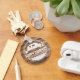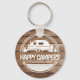 Un porte - clé simple mais élégant avec la phrase "Happy Campers". Customisez avec votre nom de famille. Montré avec un arrière - plan rustique en lattes de bois, parfait pour tenir vos clés de camping-car ou de camping-car.