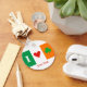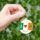 Le drapeau tricolore irlandais avec un coeur rouge dans le panneau blanc central du drapeau, un shamrock vert sur le panneau orange du drapeau sur la droite, et la lettre I en blanc contre l'arrière - plan du panneau vert du drapeau sur la gauche. Lire de gauche à droite les symboles express " I love / heart Shamrocks " Le texte en bas est personnalisable et peut être personnalisé et déplacé n'importe où sur le keyring Facile à customiser et à personnaliser. La collection I Love (Heart) Shamrock Irlande