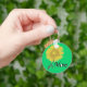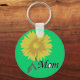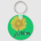 Cette image est d'une marguerite jaune sur une tige avec une feuille verte. Le mot "Maman" est imprimé près du bas du dessin. Un dossier vert a été ajouté à cette conception. Disponible dans un assortiment de styles et de tailles de ces porte - clés.