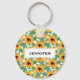 Un porte - clé avec un mignon motif d'été. Joli tournesol jaune entouré de feuilles verts dans un motif répétitif. Un cadre rectangle blanc superposé avec votre texte à l'intérieur.