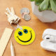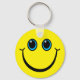 Ce porte - clé présente un joyeux visage d'émoticônes jaunes avec des yeux bleus.