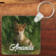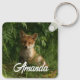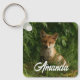 Un porte - clé avec une photo montrant un mignon petit renard à fourrure rouge et blanche. Entouré de feuilles et d'herbes verdoyants.