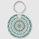 Ce mandala en cercle concentrique comporte des couches de motifs blancs, turquoise et marron inspirés des tissages celtes et du henné indien, tels que des vignes, des rubans et des fleurs de lotus.