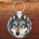 Une peinture acrylique d'un loup gris sur un arrière - plan bleu.