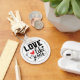 Religious typography "Love Like Jesus" with a red heart, and curled lines, scroll work, with a round black border. Customizable name on the back.