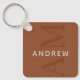 Ce porte - clé marron en terre cuite élégant dispose d'un agencement moderne avec monogramme vertical de grand type, et votre nom en simple rouge teinté blanc type horizontal.
