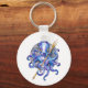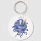 une aquarelle traditionnelle d'une pieuvre bleue et violette, de kraken ou de calmar tenant un trident doré dans ses tentacules sur un porte - clé.