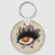 Porte - clé étrange aux yeux avec l'illustration numérique d'un oeil féminin à l'iris cassé en lave et de longues cils se terminant par des fleurs bizarres avec des pétales angés dans un ciel gris nuageux.