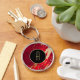 Ce porte - clé séduisant présente votre monogramme en or au centre d'une bannière en cercle noir, bordée d'or brillant. La bannière est placée sur un arrière - plan rouge vif à dégradé qui semble avoir été taché de peinture métallique dorée. Fait une belle farce de bas ou un cadeau!