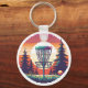 Illustration d'un parcours de golf à disques avec panier, pins et couché de soleil dans un style de vibes de jeu d'art 8 bits.