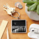 Un porte-clés avec une photographie de la Tour Eiffel en noir et blanc