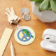 Ce dessin coloré de perroquet vert est joyeusement perché à l'intérieur d'un grand symbole de paix bleu, sur lequel il mâchait apparemment ! Idéal pour les fans aviaires qui croient en la paix. Ce porte - clé de perroquets mignon est parfait pour les amateurs d'oiseaux.