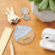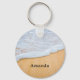 Un porte - clé avec la photo d'une plage de sable brun doré au surf mousse blanc.