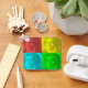 Portrait de Beethoven en carré rouge, jaune, bleu et vert. Image avec effet sculpté appliquée au design. Porte - clés personnalisés.