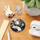 This button keychain features my portrait of a rat waiter carrying a tray of wine glasses in a restaurant. The portrait is based on a real pet Reily who would often stand on his back legs. I saw the opportunity to add an apron to him and a tray of wine to create a surreal picture.
