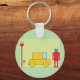 Un robot à l'allure rétro se tenant à côté d'une voiture jaune. Cette conception semble vraiment efficace sur ce Porte - clé