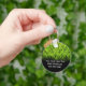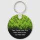 Service de pelouse promotionnel porte - clés dans une mise en page simple avec trois lignes pour votre nom d'entreprise, votre nom et votre numéro de contact avec un graphique de pelouse verte dans l'arrière - plan. Utilisez-les pour promouvoir votre entreprise avec une main pratique que vos clients peuvent utiliser pour un porte-clé pour clés de maison ou de voiture. Une façon économique de faire connaître vos services.