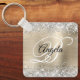 Elégante parties scintillant en argent avec éclat contre une fausse image graphique en feuille de métal brossé or de champagne pâle. On peut customiser le monogramme de calligraphie fantaisie noir et blanc au centre. Tous les éléments brillants et brillants de ce design girly moderne sont des graphismes numériques. Une précieuse fête de porte - clé monogrammée favorise sa fête d'anniversaire spéciale.