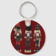 Ce porte - clé à boutons, zip pull, dispose de trois soldats de Noisettes de Noël colorés, traditionnels, en bois, un avec une hache, un avec des cymbales, et un avec une épée. L'arrière - plan est rouge foncé. Un joli cadeau ou remplissage de bas.