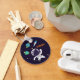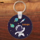 Un porte - clé personnalisé avec un arrière - plan bleu foncé aux étoiles jaunes parsemé. Couché sur le dessus est l'illustration d'un astronaute vêtu d'une combinaison blanche flottant dans l'espace. Au loin, il y a des planètes avec des anneaux et un vaisseau-fusée qui explose vers des endroits inconnus.