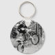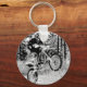 Un cavalier qui roule dans les bois sur son vélo de terre en noir et blanc.