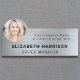 Marque d'identification de photo professionnelle brossée moderne en argent faux métallique. Téléchargez la photo de l'employé et ajoutez le nom de votre entreprise ou un autre texte ainsi que le nom et le titre de l'employé en simple typographie.
