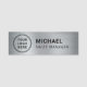 Marque de nom de travail moderne avec le logo de votre entreprise ou de votre organisation contre un faux arrière - plan métallique en argent. Ajoutez un nom et un titre dans une simple typographie.