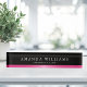 Elégante plaque de nom avec votre nom et titre imprimé en blanc sur un arrière - plan noir au-dessus d'un dégradé de satin rose.