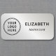 Nom professionnel avec le logo de votre entreprise ou organisation sur un faux arrière - plan métallique en argent. Ajoutez un nom et un titre ou une position dans une simple typographie.
