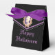 Dieses Halloween Fvor Box zeigt ein Portrait eines Skeletts auf der Frontklappe. Am unteren Rand liest sich der Text, Happy Halloween. Auf der Rückseite der Kiste befindet sich ein Skelettkopf mit einem Hut. Sie können diese Box anpassen, indem Sie Ihren eigenen Text hinzufügen und die Farbbandfarbe ändern. Die Hintergrundfarbe kann auch angepasst werden.