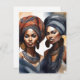 Zwei Frauen werden mit lebendigen Kopfhüllen und großen Ohrringen dargestellt, die ein Gefühl von kulturellem Reichtum und Eleganz ausstrahlen. Ihre Ausstattung umfasst aufwändig gestaltete Halsketten, die den Sinn für Stil und Tradition noch verstärken.
