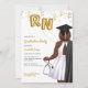 Portrait Nursing School Graduation Party Einladung. Afroamerikanische Krankenschwester Einladung für Ihre Tochter, Nichte, Mutter, Tante, Cousin oder Freundin, die von der Krankenschwester geschlossen wird und nun offiziell Krankenschwester ist. Abschluss der Kinderheilkunde Einladung für Party zum Studium von Frauen, die gerade ihren Abschluss in der Kinderheilschule gemacht haben. Feiern Sie die neue registrierte Krankenschwester mit diesem eleganten Abschluss! Das Porträt einer dunklen Haut, sowie eine Frau in der Größe mit braunem, gewelltem Haar. Die Krankenschwester hat ein stilvolles, weißes Kleid auf sich, einen schwarzen Abschluss, der über ihre Schulter gezogen ist, und eine passende schwarze Graduationskappe. Sie hält Ballons im Goldfolienstil mit den Buchstaben RN in der einen Hand und einem Stethoskop in der anderen Hand. Mit glänzenden Goldkonfetti verkörpert sie perfekt die Freude und Spannung ihrer großen Errungenschaft.