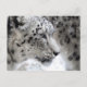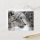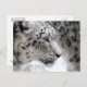 Ein naher Aufstieg eines Schneeleoparden im Profil während eines Schneesturms.