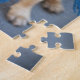Ein schönes Puzzlespiel mit dem sehr entzückenden kleinen Mops, der einen blauen Schal auf einem Hintergrund einer Ziegelsteinwand mit Elementen von Graffiti trägt.
