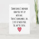 "Parfois, je me demande comment tu me supportes. Alors je me souviens, oh, j'ai supporté avec toi. Donc, nous sommes même." Cette carte amusante a un anneau de vérité, peu importe qui vous êtes, et est parfaite pour votre Anniversaire ou la Saint-Valentin, ou n'importe quand !