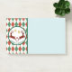 Des notes collantes avec un cercle qui dit "Joyeux Noël" à l'intérieur en texte courbe. Conçu avec une illustration de 2 cerfs de Noël sautant. Les cerfs sont faits de sériole rouge et noire, avec un peu de coeur entre eux. Parties scintillant d'or Faux Les décorations de Noël sont suspendues au sommet. L'arrière - plan est un motif Jacquard rouge et vert.