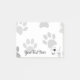 Joli petit Bull Terrier anglais, blanc avec patchs à oeil noir, sur un arrière - plan de empreintes de pattes en nuances de gris...classique !