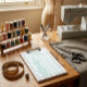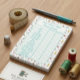 Design: Clean teal-colored table set against a whimsical sewing-themed illustrative pattern.
