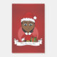 Design avec l'illustration d'une jolie fille noire souriante et souriante aux cheveux courts, elle porte le costume de Père Noël rouge et blanc et tient un cadeau; avec texte modifiable modèle pour votre nom ou message, Noël design avec un arrière - plan rouge